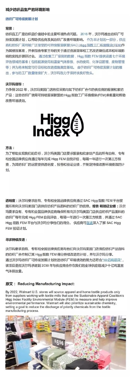 · 沃爾瑪要求其供應美國沃爾瑪門店的自有/專有/全國品牌的服裝供應商/軟家紡產(chǎn)品供應商/供應紡織產(chǎn)品面料的紡織廠在2022年之前, 每年完成一次Higg FEM的自評;