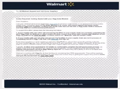 沃爾瑪要求下屬服裝和家紡行業(yè)的供應(yīng)商全面實(shí)施 HIGG FEM自評,并正式下達(dá)了通知函,具體內(nèi)容如下: