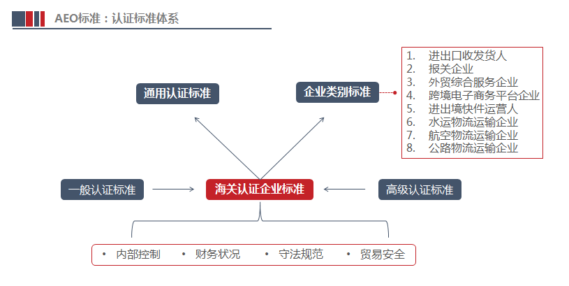 截至目前,《海關(guān)認(rèn)證企業(yè)標(biāo)準(zhǔn)》體系為“1+8”模式,即,通用標(biāo)準(zhǔn)加進(jìn)出口收發(fā)貨人、報(bào)關(guān)企業(yè)、外貿(mào)綜合服務(wù)企業(yè)、跨境電子商務(wù)平臺(tái)企業(yè)、進(jìn)出境快件運(yùn)營人、水運(yùn)物流運(yùn)輸企業(yè)、航空物流運(yùn)輸企業(yè)、公路物流運(yùn)輸企業(yè)8個(gè)單項(xiàng)標(biāo)準(zhǔn)。